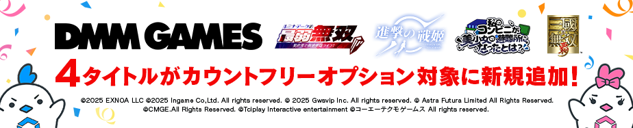下記のゲームは、DMM GAMESのサイトに記載されているプラットフォームのみカウントフリーオプション対象となります。 【あ行】 アートワール魔法学園の乙女たち, アイドルうぉーず~100人のディーバと夢見がちな僕~, 愛の獣よ、神の掟に背いて禁断の果実を貪れ, あいりすミスティリア!~少女のつむぐ夢の秘跡~, アカシッククロニクル~黎明の黙示録, アサルトリリィ Last Bullet, アストラルパーティー, あやかしっくレコード, アライアンスセージ 最強健全版, アリス・ギア・アイギス, アンカーパニック, ANGELICA ASTER, UNLIGHT:Revive, イケメン戦国◆時をかける恋, 一騎当千エクストラバースト, ヴァンパイア†ブラッド, Echocalypse -緋紅の神約-, SDガンダムオペレーションズ, ETERNAL, エターナルツリー:新生, エタクロニクル:Re, エデンズリッターグレンツェ, えとはなっ!~干支っ娘・花札バトル~, 絵本のような農園生活チョコッと農園, エリシアムレコード, エンジェリックリンク, エンバーストーリア, 億万長者-総裁の花道、美女たちの恋-, 御城プロジェクト:RE~CASTLE DEFENSE~, オリエント・アルカディア, オレの彼女はJKOL!!, 陰陽師本格幻想RPG 【か行】 ガールズクリエイション -少女藝術綺譚-, 輝け、ナビ少女!, 学園アイドルマスター, 陰の実力者になりたくて!マスターオブガーデン, 神々のふんわり育成日誌!~放置で推せる極楽神生活~, 神に愛された花嫁~真夜中の契り~, 神になるッ!-下剋上の修行伝, ガルショ☆, 騎士と翼のフロンティア, キャットファンタジー:猫娘冒険RPG, ○乳ファンタジーバースト, 銀行マンの下剋上 〜バラ色人生を目指して〜N, クリスタル オブ リユニオン, クリムゾン妖魔大戦, クレイジー・キング, クレイヴ・サーガ 神絆の導師, Game of Thrones Winter is Coming, けものフレンズ3, 剣が刻, 煌星三国~六宮の絆~, コードギアス 反逆のルルーシュ ロストストーリーズ 【さ行】 サイコロ7 BATTLE KING, 桜の恋:学院物語, Xanadu Land, 三国猛将伝, しまった!美人に囲まれた!, 終末の戦姫, 宝石姫 Reincarnation, シュガーコンフリクト-眠るセカイと神々の喰園-, シルバー・アンド・ブラッド, 城姫クエスト 極, 進撃の戦姫:一撃必殺、超快感バトルRPG!, 真・三國無双 覇, スイートホームメイド, STELLAR IDOL PROJECT, スノウブレイク:禁域降臨, スロットストリート, 〜聖戦の残響〜美少女とともに世界を救おう!, 世界一初恋, 戦国IXA, 戦国†恋姫オンライン~奥宴新史~, 戦乱プリンセス, 蒼焔の艦隊, 総裁の野望 -美女養成計画-, ソウルメイデン, ソウルワーカー ‐SoulWorker‐, ソリティア BATTLE ROYAL, ソリティア漫遊記 【た行】 大軍師, 大三国志, 対魔忍RPG, 弾丸キス~恋の捜査ファイル~, DeepOne 虚無と夢幻のフラグメント, ティンクルスターナイツ, デタリキZ 特別防衛局隊員の日常, DEAD OR ALIVE Xtreme Venus Vacation, DEAD or LOVE~狂愛の無人島~, デッドランド-ZONE-Z-, 天下一★戦国LOVERS, 天啓パラドクス, 転職魔王~リストラ勇者のお仕置きセレナーデ~, 東京リベンジャーズ Last Mission, ドタバタ王子くん, ドラグーン・ナイツ, ドラゴンタクティクス, トリオズ BATTLE KING, ドルフィンウェーブ 【な行】 成り上がり〜華と武の戦国, 2角取り BATTLE KING, 2048改 BATTLE KING, 2.5次元の誘惑 天使たちのステージ,熱戦少女 【は行】 ハーレムオブトーキョー, 覇界戦志~時空を超え新王となれ~, 幕末維新 天翔ける恋, パズスラ BATTLE KING, パズル通 BATTLE KING, パズル BATTLE KING, ハツリバーブ, バヌシ伝説, パネル&トレース, ビーナスライブ, ビーナスライブ for Android, ヒーローズクラウン, 日替わり内室, 100万人のWinning Post Special, ピュア専☆天使クラブ, 怪盗夜想曲~ファントムノクターン~, フェアリードール, ブラウザ三国志, FLOWER KNIGHT GIRL, プリンセスエンパイア, ブルーロック BLAZE BATTLE, BLESS UNLEASHED, ブロック崩し BATTLE KING, 文豪とアルケミスト, 崩壊リバーシ, 放置ファンタジー, 放浪仙人〜借金取りと妖怪退治の旅〜, ぼくのレストラン2, ぼくらの放課後戦争!-AFTER SCHOOL WARS- 【ま行】 麻雀サンマリーグ, 毎日こつこつ俺タワー, 魔王カリンちゃんRPG 〜恋姫建国奔走記〜, 魔界王子と魅惑のナイトメア, 魔界戦記ディスガイアRPG ~最凶魔王決定戦!~, MASS FOR THE DEAD, ミストトレインガールズ~霧の世界の車窓から~, ミナシゴノシゴト, 夢幻楼と眠れぬ蝶, メイプルストーリーR: エボリューション, 女神楽園 ガーデス·パラダイス, メカむすメーカー, メメントモリ, 萌えCanちぇんじ!, モテキ・タッチラブ, モンスター娘TD~ボクは絶海の孤島でモン娘たちに溺愛されて困っています~ 【や行】 勇者なんてお断り!, ゆるキャン△つなげるみんなのオールインワン!!, よろず社の神ならい 【ら行】 ライバルアリーナVS, ラグナドール 妖しき皇帝と終焉の夜叉姫, ラストオリジン, ラストクラウディア, ラスト・ラグナレク, L'abysse Project, LOVE:QUIZ~恋する乙女のファイナルアンサー~, League of Angels 3, League of Angels: Pact, ReOath-巨神と誓女 外典-, りっく☆じあ〜す, リバース:1999, リベリオン ギルガメッシュ, ルミナ・アークの最弱無双, レゾナンス:無限号列車 