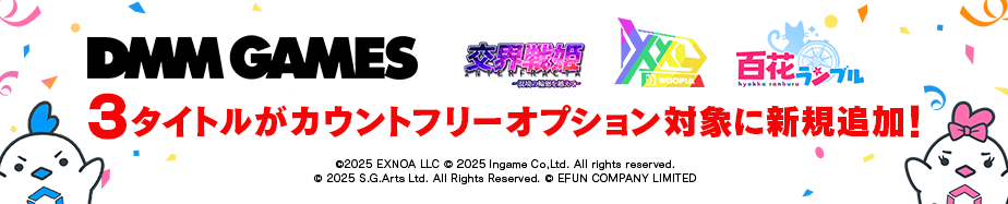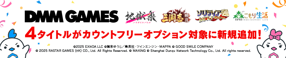 下記のゲームは、DMM GAMESのサイトに記載されているプラットフォームのみカウントフリーオプション対象となります。 【あ行】 アートワール魔法学園の乙女たち, アイドルうぉーず~100人のディーバと夢見がちな僕~, 愛の獣よ、神の掟に背いて禁断の果実を貪れ, あいりすミスティリア!~少女のつむぐ夢の秘跡~, アカシッククロニクル~黎明の黙示録, アサルトリリィ Last Bullet, アストラルパーティー, あやかしっくレコード, アライアンスセージ 最強健全版, アリス・ギア・アイギス, アンカーパニック, ANGELICA ASTER, UNLIGHT:Revive, イケメン戦国◆時をかける恋, ヴァンパイア†ブラッド, Echocalypse -緋紅の神約-, SDガンダムオペレーションズ, ETERNAL, エターナルツリー:新生, エタクロニクル:Re, エデンズリッターグレンツェ, えとはなっ!~干支っ娘・花札バトル~, 絵本のような農園生活チョコッと農園, エリシアムレコード, エンジェリックリンク, エンバーストーリア, 億万長者-総裁の花道、美女たちの恋-, 御城プロジェクト:RE~CASTLE DEFENSE~, オリエント・アルカディア, オレの彼女はJKOL!!, 陰陽師本格幻想RPG 【か行】 ガールズクリエイション -少女藝術綺譚-, 輝け、ナビ少女!, 学園アイドルマスター, 陰の実力者になりたくて!マスターオブガーデン, 神々のふんわり育成日誌!~放置で推せる極楽神生活~, 神に愛された花嫁~真夜中の契り~, 神になるッ!-下剋上の修行伝, ガルショ☆, 騎士と翼のフロンティア, キャットファンタジー:猫娘冒険RPG, ○乳ファンタジーバースト, 銀行マンの下剋上 〜バラ色人生を目指して〜N, クリスタル オブ リユニオン, クリムゾン妖魔大戦, クレイジー・キング, クレイヴ・サーガ 神絆の導師, Game of Thrones Winter is Coming, けものフレンズ3, 剣が刻, 交界戦姫インターフラクタ~混境の輪廻を越えて~, 煌星三国~六宮の絆~, コードギアス 反逆のルルーシュ ロストストーリーズ 【さ行】 サイコロ7 BATTLE KING, 桜の恋:学院物語, Xanadu Land, 触ったら少女に~指一本で救世する少年の話~, 三国志:戦乱, 三国猛将伝, 地獄楽 パラダイスバトル, しまった!美人に囲まれた!, 終末の戦姫, 宝石姫 Reincarnation, シュガーコンフリクト-眠るセカイと神々の喰園-, シルバー・アンド・ブラッド, 城姫クエスト 極, 進撃の戦姫:一撃必殺、超快感バトルRPG!, 真・三國無双 覇, スイートホームメイド, STELLAR IDOL PROJECT, スノウブレイク:禁域降臨, スロットストリート, 〜聖戦の残響〜美少女とともに世界を救おう!, 世界一初恋, 戦国IXA, 戦国†恋姫オンライン~奥宴新史~, 戦乱プリンセス, 蒼焔の艦隊, 総裁の野望 -美女養成計画-, ソウルメイデン, ソウルワーカー ‐SoulWorker‐, ソリティア BATTLE ROYAL, ソリティア通 BATTLE ROYAL, ソリティア漫遊記 【た行】 大軍師, 大三国志, 対魔忍RPG, XXL 漢気二丁目, 弾丸キス~恋の捜査ファイル~, DeepOne 虚無と夢幻のフラグメント, ティンクルスターナイツ, デタリキZ 特別防衛局隊員の日常, DEAD OR ALIVE Xtreme Venus Vacation, DEAD or LOVE~狂愛の無人島~, デッドランド-ZONE-Z-, 天下一★戦国LOVERS, 天啓パラドクス, 転職魔王~リストラ勇者のお仕置きセレナーデ~, ドタバタ王子くん, ドラグーン・ナイツ, ドラゴンタクティクス, トリオズ BATTLE KING, ドルフィンウェーブ 【な行】 成り上がり〜華と武の戦国, 2角取り BATTLE KING, 2048改 BATTLE KING, 2.5次元の誘惑 天使たちのステージ,熱戦少女 【は行】 ハーレムオブトーキョー, 覇界戦志~時空を超え新王となれ~, 幕末維新 天翔ける恋, パズスラ BATTLE KING, パズル通 BATTLE KING, パズル BATTLE KING, バヌシ伝説, パネル&トレース, ビーナスライブ, ビーナスライブ for Android, ヒーローズクラウン, 日替わり内室, 100万人のWinning Post Special, 百花ランブル, ピュア専☆天使クラブ, 怪盗夜想曲~ファントムノクターン~, フェアリードール, ブラウザ三国志, FLOWER KNIGHT GIRL, プリンセスエンパイア, ブルーロック BLAZE BATTLE, BLESS UNLEASHED, ブロック崩し BATTLE KING, 文豪とアルケミスト, 崩壊リバーシ, 放置ファンタジー, 放浪仙人〜借金取りと妖怪退治の旅〜, ぼくのレストラン2, ぼくらの放課後戦争!-AFTER SCHOOL WARS- 【ま行】 麻雀サンマリーグ, 毎日こつこつ俺タワー, 魔王カリンちゃんRPG 〜恋姫建国奔走記〜, 魔界王子と魅惑のナイトメア, 魔界戦記ディスガイアRPG ~最凶魔王決定戦!~, MASS FOR THE DEAD, ミストトレインガールズ~霧の世界の車窓から~, ミナシゴノシゴト, 夢幻楼と眠れぬ蝶, メイプルストーリーR: エボリューション, 女神楽園 ガーデス·パラダイス, メカむすメーカー, メメントモリ, 萌えCanちぇんじ!, モテキ・タッチラブ, 森こもり生活, モンスター娘TD~ボクは絶海の孤島でモン娘たちに溺愛されて困っています~ 【や行】 勇者なんてお断り!, ゆるキャン△つなげるみんなのオールインワン!!, よろず社の神ならい 【ら行】 ラグナドール 妖しき皇帝と終焉の夜叉姫, ラストオリジン, ラストクラウディア, ラスト・ラグナレク, 落下式2角取り, L'abysse Project, LOVE:QUIZ~恋する乙女のファイナルアンサー~, League of Angels 3, りっく☆じあ〜す, リバース:1999, 
